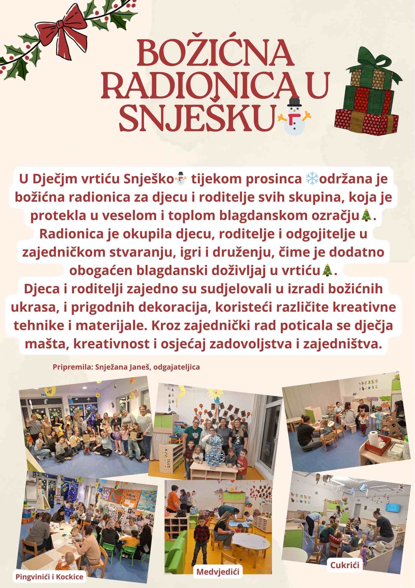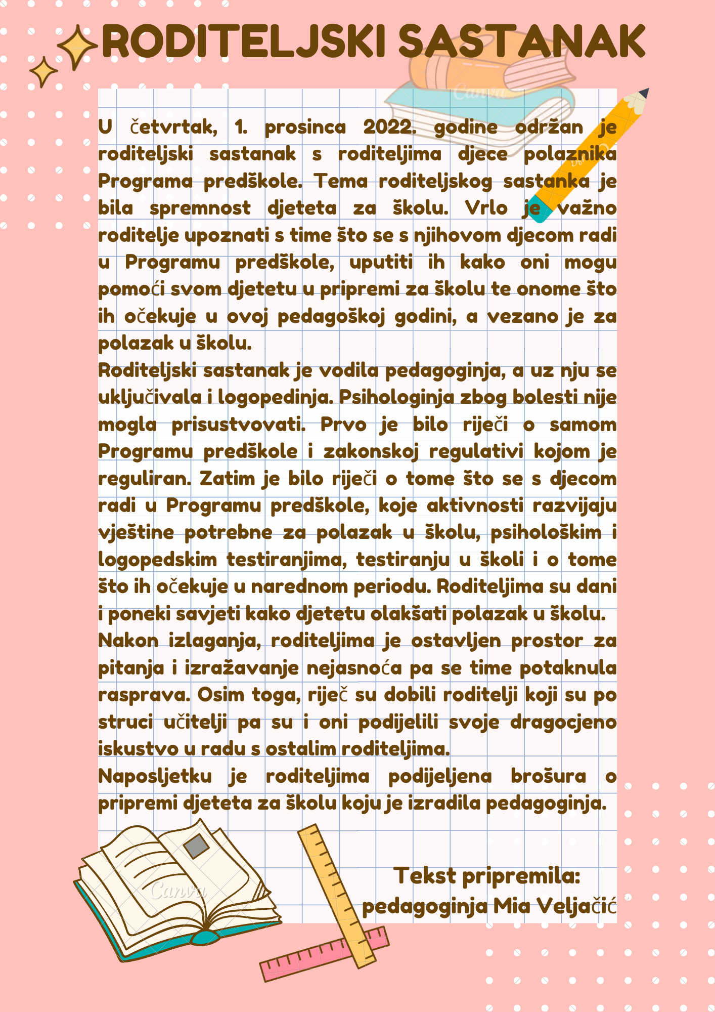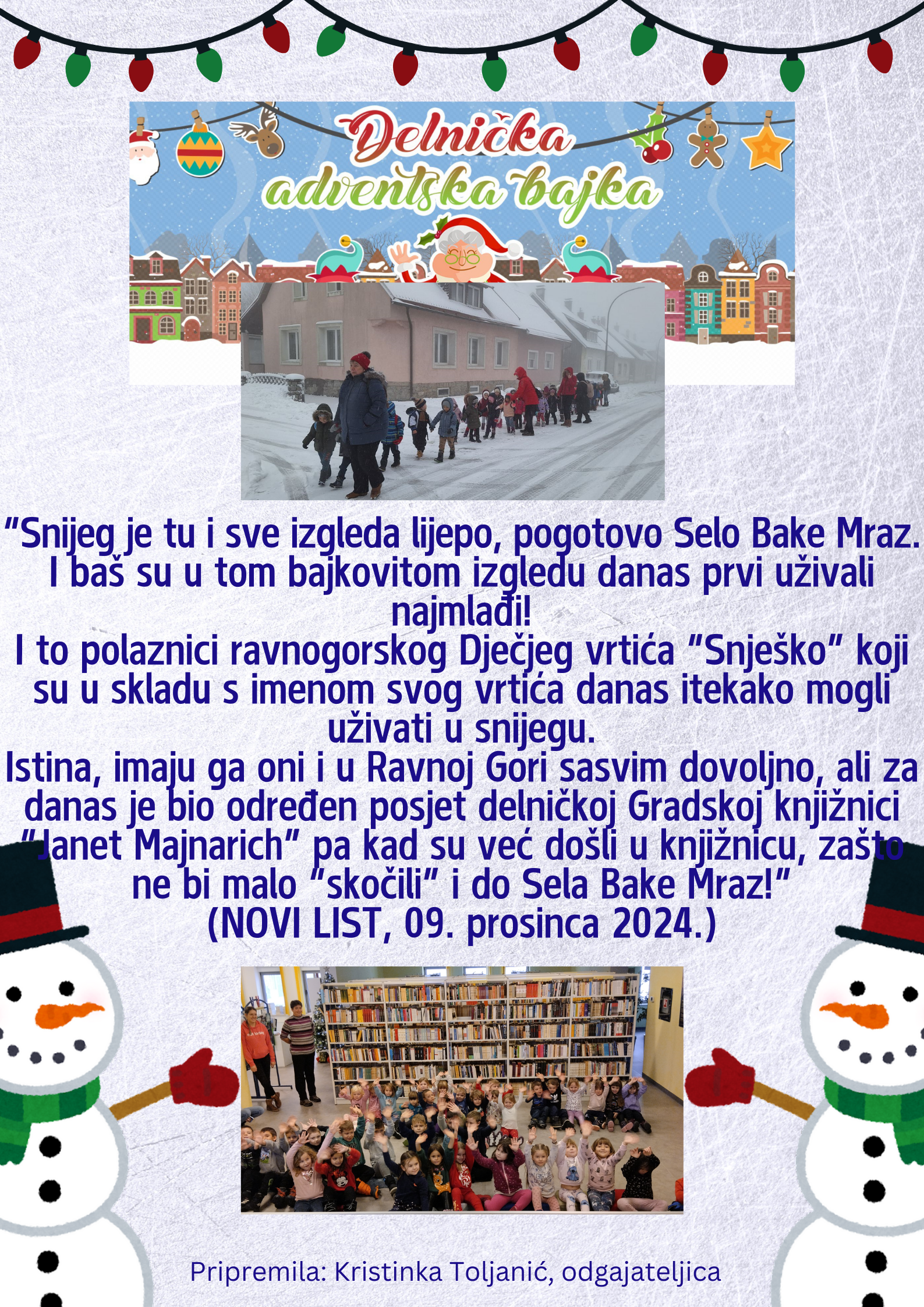 Dječji vrtić „Snješko“, temeljem članka 23.a Zakona o predškolskom odgoju i obrazovanju (NN, br. 10/97, 107/07 i 93/13), Državnog pedagoškog standarda predškolskog odgoja i naobrazbe (NN, br. 63/08 i 90/10), pravilnika o sadržaju i trajanju programa predškole (NN, br. 107/14) te suglasnosti načelnika Općine Ravna Gora, objavljuje